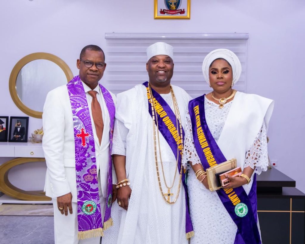 In celebration of his 49th birthday on the 2nd of April, The Chairman and Chief Executive Officer of Adron Homes and Properties; Aare Adetola Emmanuelking and his wife Yeye Aderonke Emmanuel King were both inducted and decorated as Otun Asiwaju Onigbagbo and Yeye Otun Asiwaju Onigbagbo of Remo Land at the Communion Faith Assembly, Garden of Faith, Kemta House Estate, Idi-Aba Abeokuta Ogun state. At the Induction ceremony, Aare Adetola and His beautiful wife were ordained by top Ogun State clergymen and members of the Christian Association of Nigeria CAN Ogun State Chapter under the leadership of Bishop Dr TUNDE Akin-Akinsanya and his team comprised of Rev Dr O Oyeniyi chairman CCN, Most Rev Dr Peter Odetoyinbo Chairman CSN, Rev Dr S.O Babayomi Chairman ECWA/TEKAN, Pastor J K Onakoya (JP) Chairman CPFN/PFN and Rev Leke Sopein Chairman OAIC who also held a special service to celebrate his birthday.