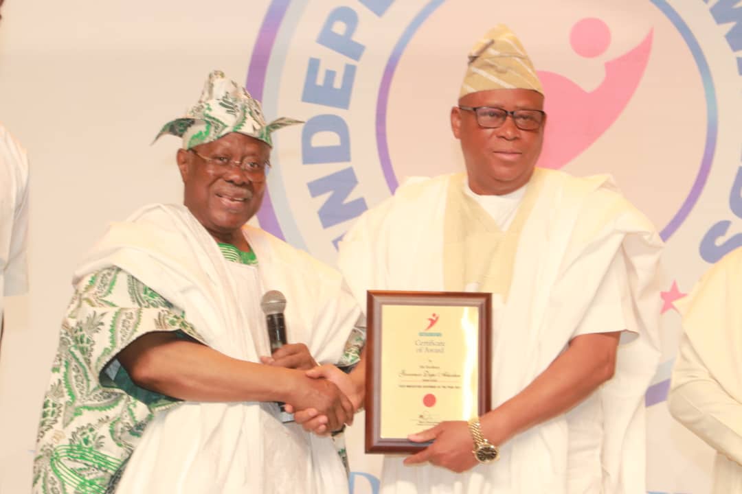 A former governor of old Ondo State, Chief Olabode George (left), presenting the Daily Independent Governor of the Year (Tech Innovation) award to the Ogun State Governor, Prince Dapo Abiodun, on Sunday. The governor was represented by his Special Adviser on Media, Hon. Kayode Akinmade.