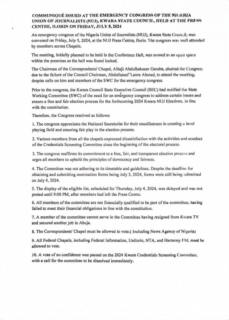 The Kwara Council State Executive Council (SEC) had earlier called for the congress to address critical issues and ensure a transparent election process for the forthcoming 2024 Kwara NUJ Elections.