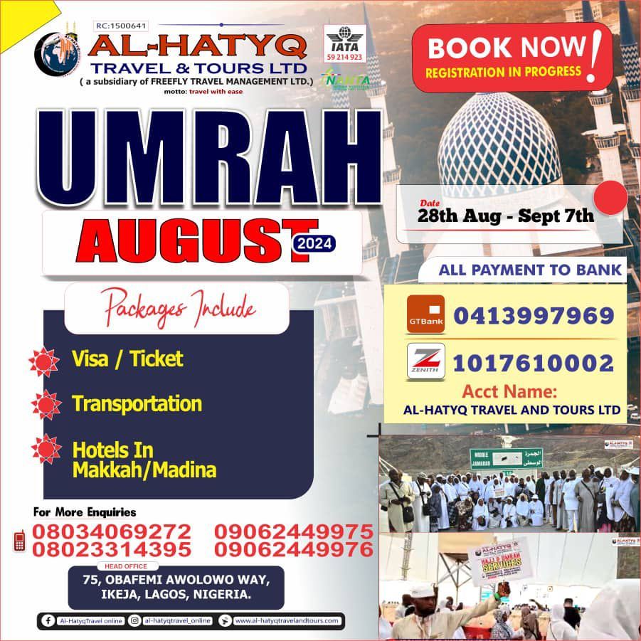 To this end, prospective travellers are advised not to miss this opportunity to perform their Umrah in August with Al-Hatyq Travel And Tours. For more information they contact: 080 3406 9272, 090 6244 9975, and +966 54 024 5635, or reach out to them through its social Media: @al_hatyqtravel_online, @walexy_badmus, or visit the firm’s Office Address at 75, Obafemi Awolowo Way, Ikeja, Lagos.
