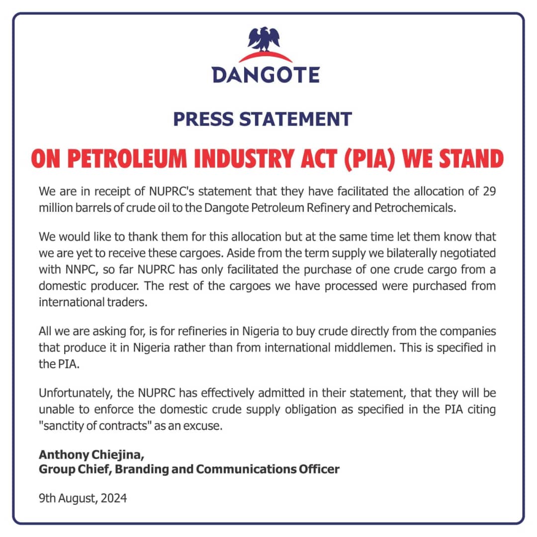 The statement reads further: “Unfortunately, the NUPRC has effectively admitted in their statement that they will be unable to enforce the domestic crude supply obligation as specified in the PIA, citing “sanctity of contracts” as an excuse.”