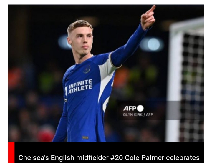 Chelsea’s English midfielder #20 Cole Palmer celebrates after scoring his fourth goal, chelsea’s fifth from the penalty spot during the English Premier League football match between Chelsea and Everton at Stamford Bridge in London on April 15, 2024