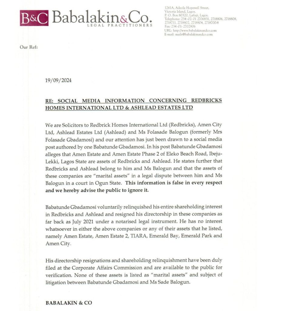“We are solicitors to Redbrick Homes International Limited (Redbrick), Amen City Ltd, Ashlead Estates Ltd (Ashlead), and Ms. Folasade Balogun (formerly Mrs. Folasade Gbadamosi). Our attention has been drawn to a social media post authored by Mr. Babatunde Gbadamosi.