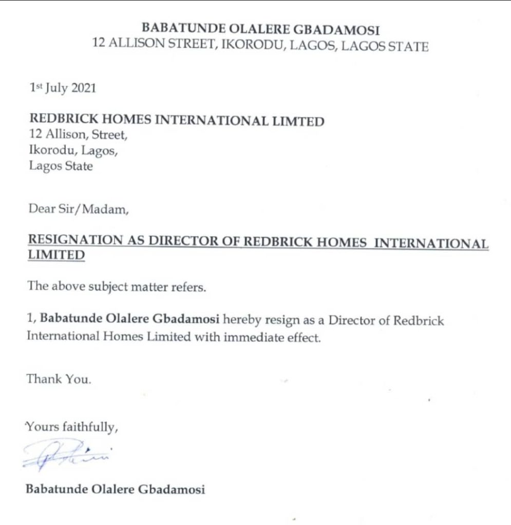 It is also worth recalling that on February 26, 2022, Redbrick Homes management published a notice in Punch to clarify to all investors and potential investors that Mr. Babatunde Olalere Gbadamosi is no longer associated with Redbrick Homes International Ltd or its real estate projects.
