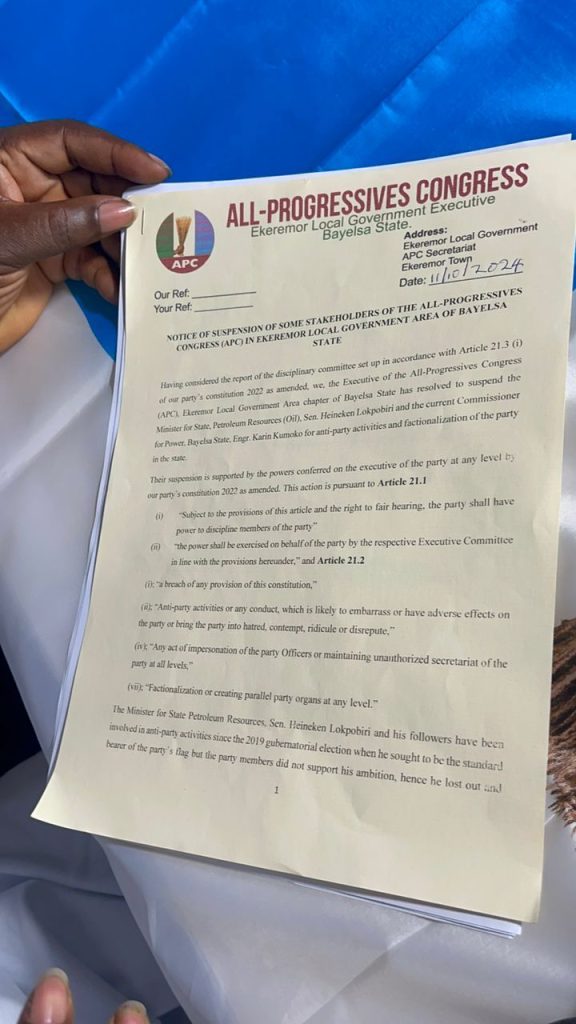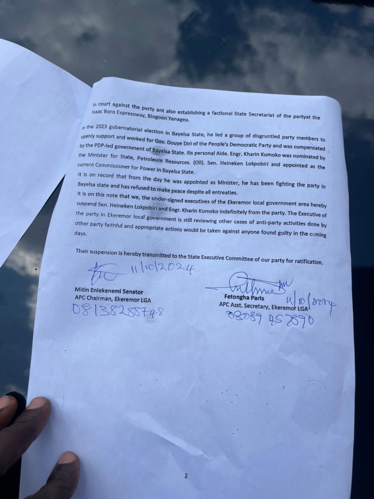 In Ekeremor LGA, the suspension notice was signed by Mitin Eniekenimi Senator, LGA APC Chairman and Loki Ebikeniye Misoro, LGA APC Secretary.