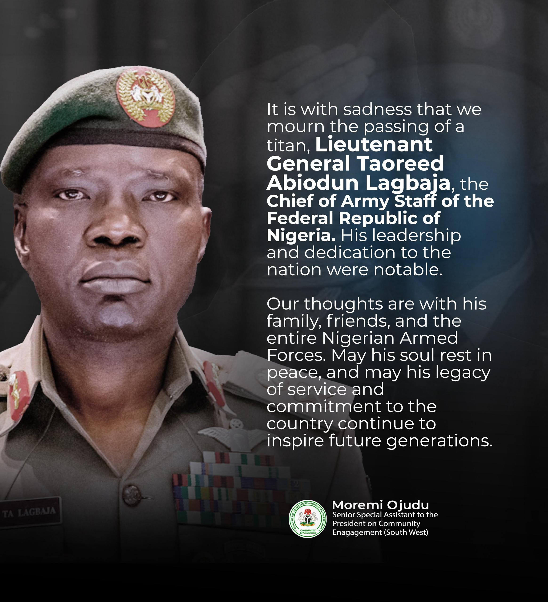 On behalf of the community engagement in the southwest region, Led by the Senior Special Assistant Moremi Ojudu, we extend our deepest condolences to the loved ones of General Taoreed Abiodun Lagbaja. May his soul rest in peace, and may his memory continue to inspire future generations of leaders in Nigeria.