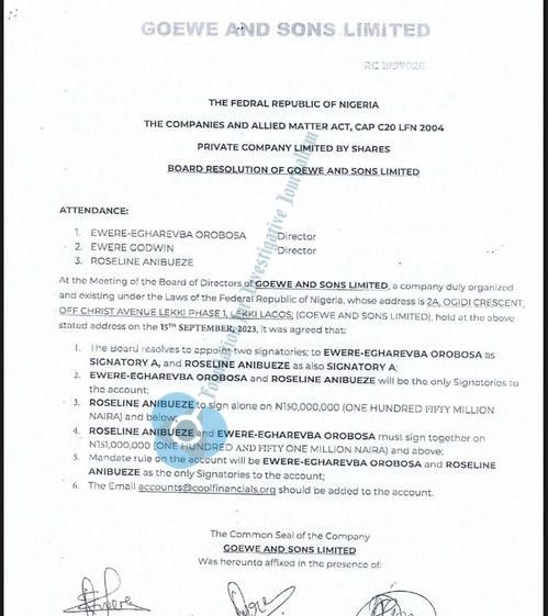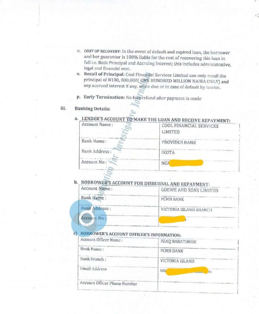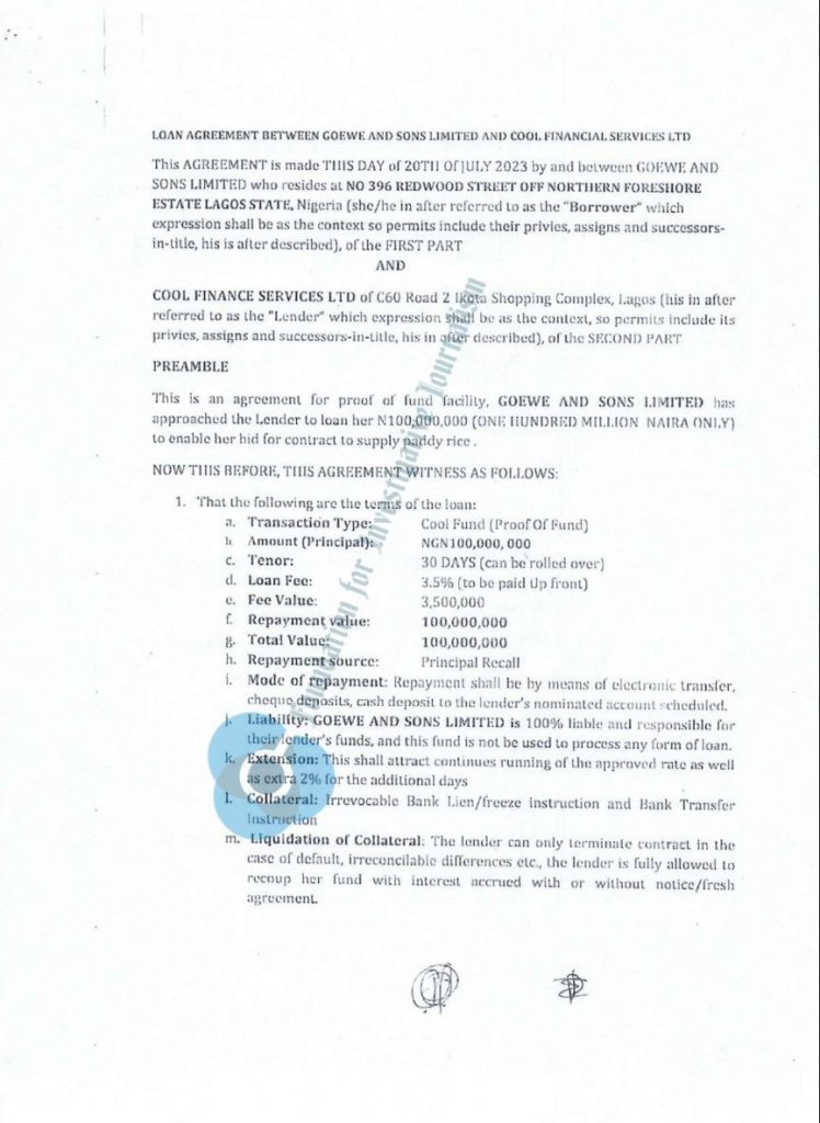 Both Goewe and Sons Ltd. and Cool Financial Services then instructed FCMB to freeze the loan account so that the loan sum could remain untouched for the period of the transaction, according to a loan agreement dated September 18, 2023.