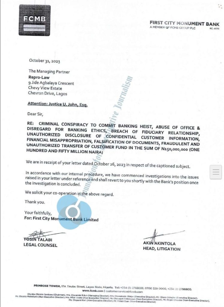 Those cure periods were not adhered to. On October 31, FCMB through Tosin Talabi and Akin Akintola, both legal counsel and head of litigation for the bank, said it had commenced an investigation into the issue.