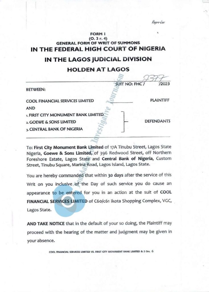 Cool Financial Services, a Lagos State-based finance house, has sued First City Monument Bank (FCMB) for allowing Goewe and Sons Ltd., one of its borrowers, to withdraw a N150 million loan sum from an account with an active freezing instruction.
