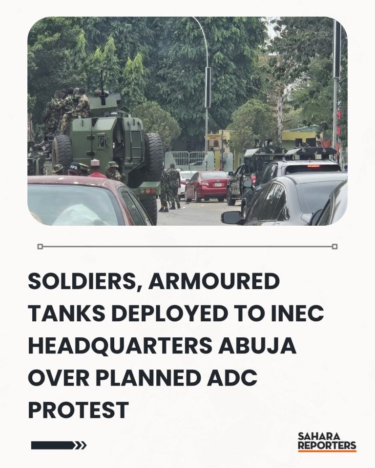 Armed soldiers and heavily equipped police operatives on Thursday took over the headquarters of the Independent National Electoral Commission (INEC) in Abuja following threats of mass protest by members of the African Democratic Congress (ADC), SaharaReporters has learnt.